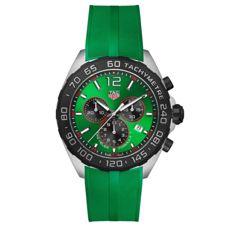 This 43mm model features a brushed stainless steel case with green dial and sapphire crystal glass. Fitted with Tag Heuer Swiss quartz movement. Presented on a green rubber strap. Water resistant to 200m. Complete with two year manufacturers guarantee and TAG Heuer branded presentation box.